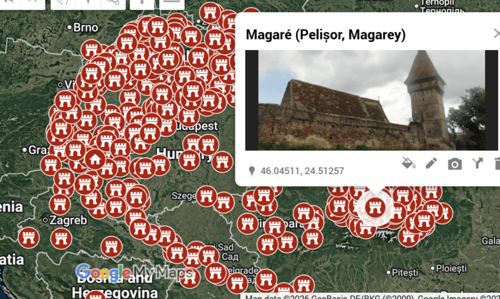 Its first written mention survives from 1357, in the form possessio Magare. Its Gothic-style hall church was built in the 15th century, initially without a tower, and later surrounded by a stone wall. Three rows of loopholes were created on its fortress wall.